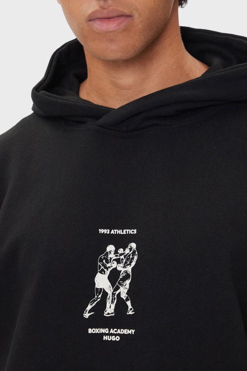 Детали: Мужской черный хлопковый худи Duwrestie от Hugo by Hugo Boss (Хуго бай Хуго Босс). Вшитый капюшон, принт на груди и на спине, карман-кенгуру, классическая длина, трикотажные манжеты и нижний край