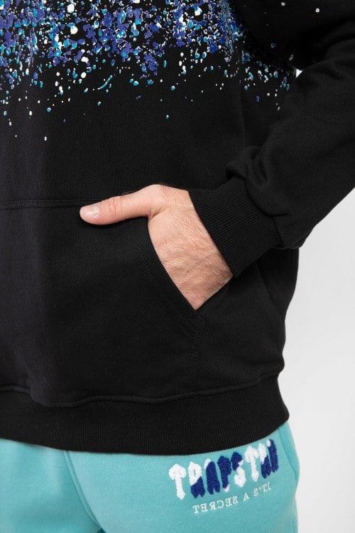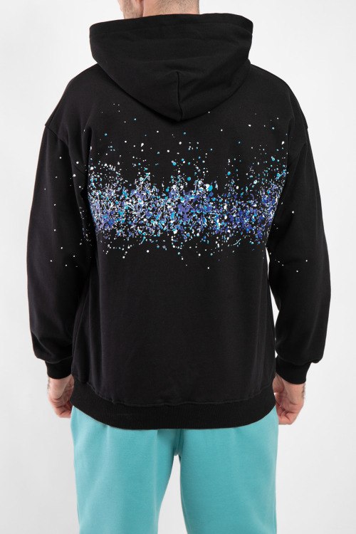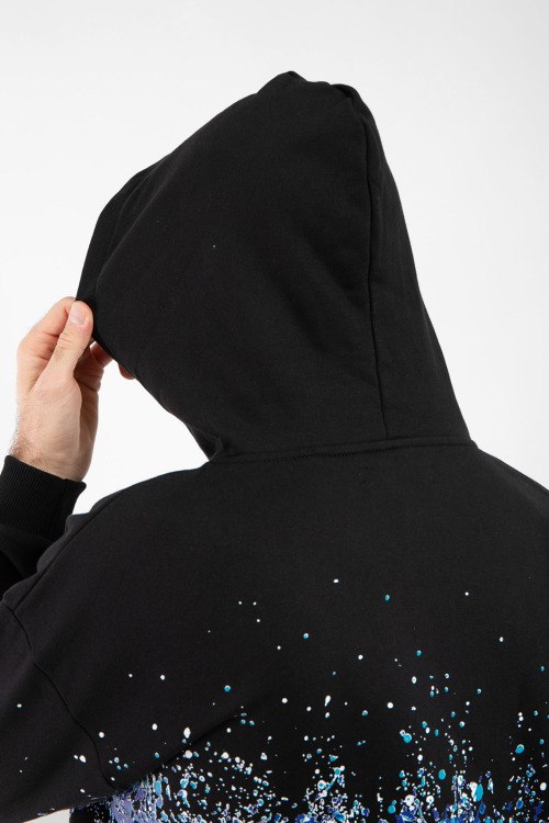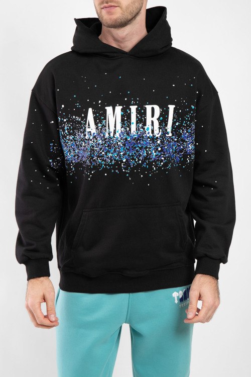 Детали: Мужской черный худи Crystal Painter из хлопка от Amiri (Амири). Вшитый капюшон, длинные рукава, манжеты и низ изделия в рубчик, модель декорирована принтом с логотипом бренда