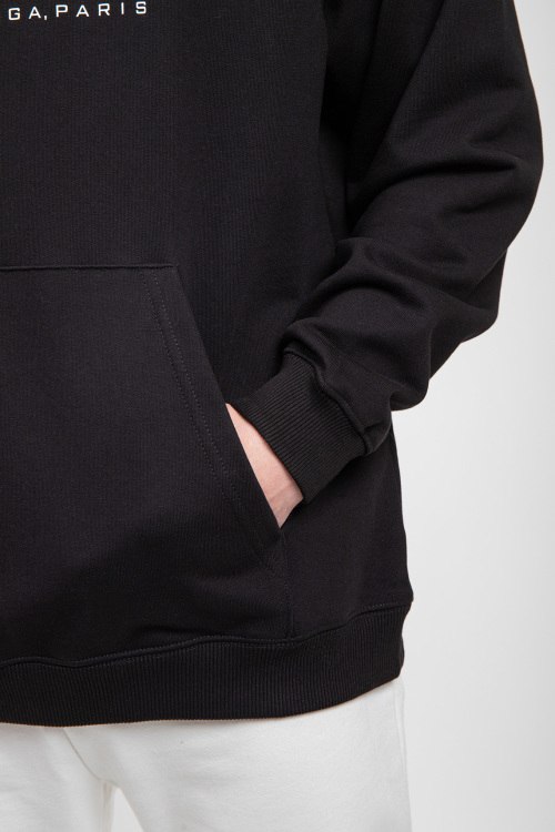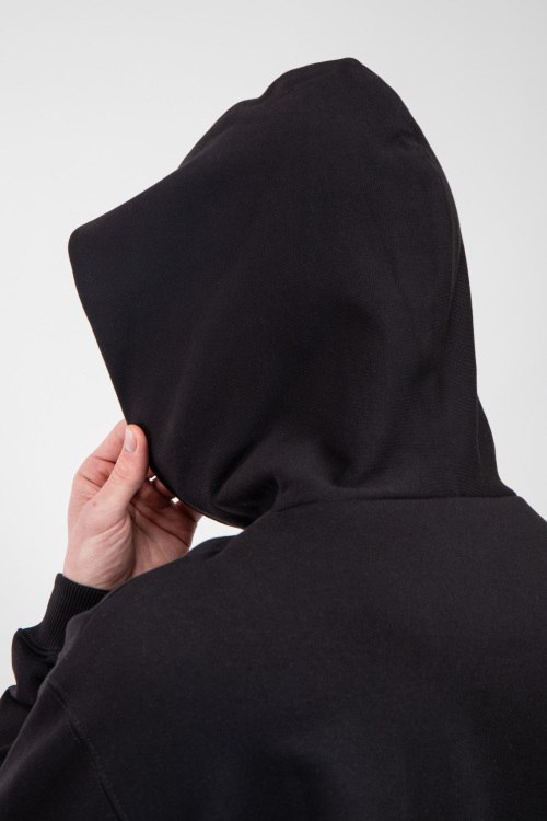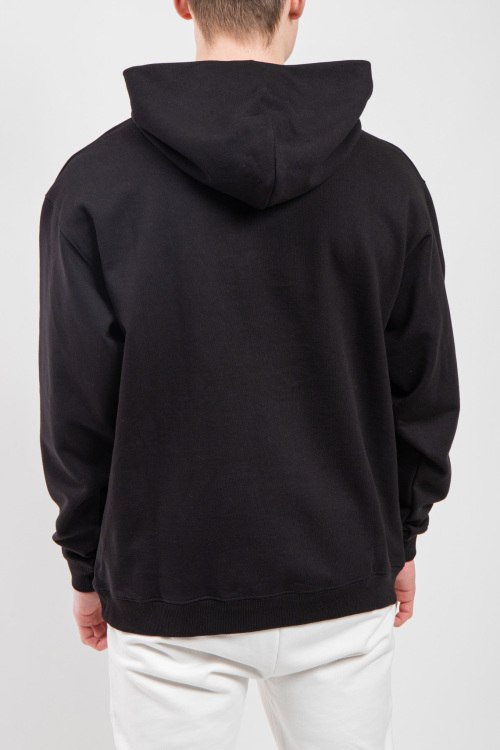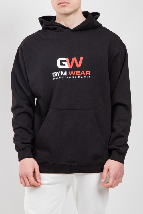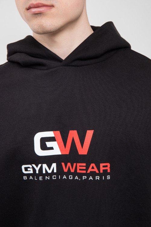 Мужской черный худи из хлопка от Balenciaga (Баленсиага). Классическая длина, вшитый капюшон, длинные рукава, трикотажная резинка на манжетах и по низу изделия, дизайн с принтом на груди.