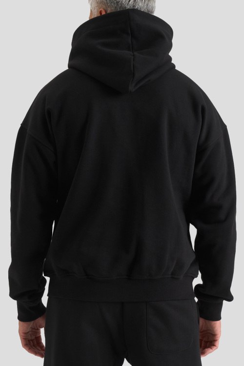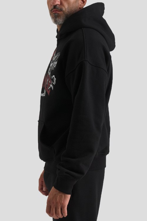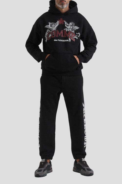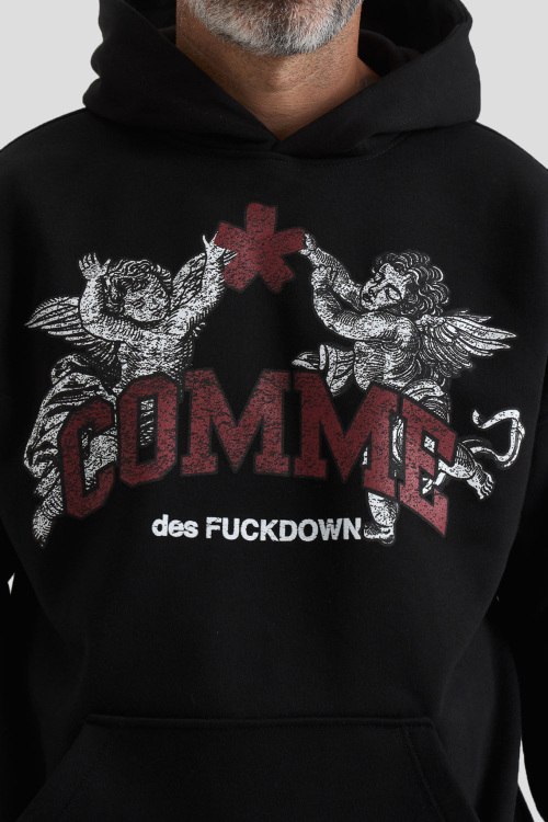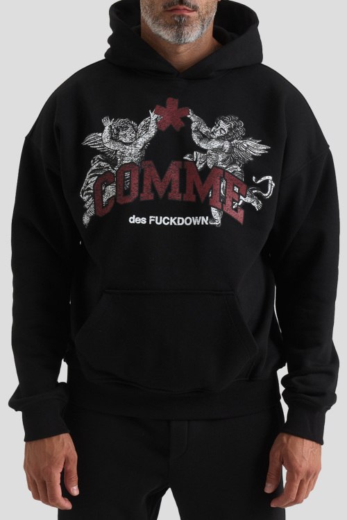 Детали: Мужской черный худи из хлопкового микса от Comme des Fuckdown (Камм дес Факдаун). Вшитый капюшон, длинные рукава, трикотажная резинка на манжетах и по низу изделия, модель декорирована брендированным принтом, карман-кенгуру