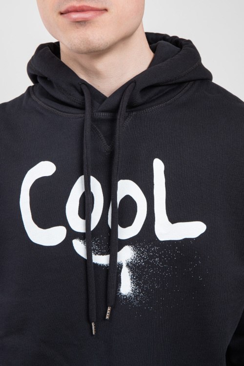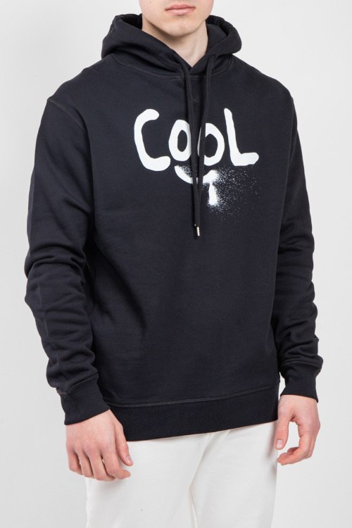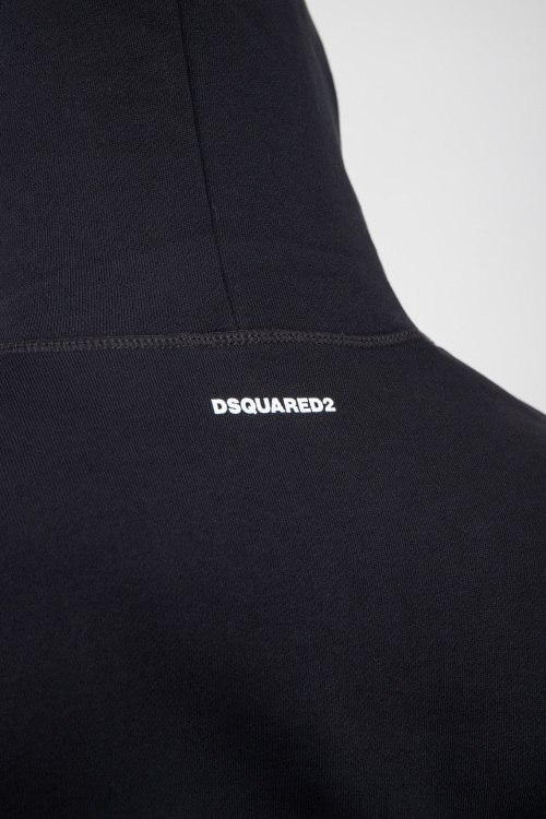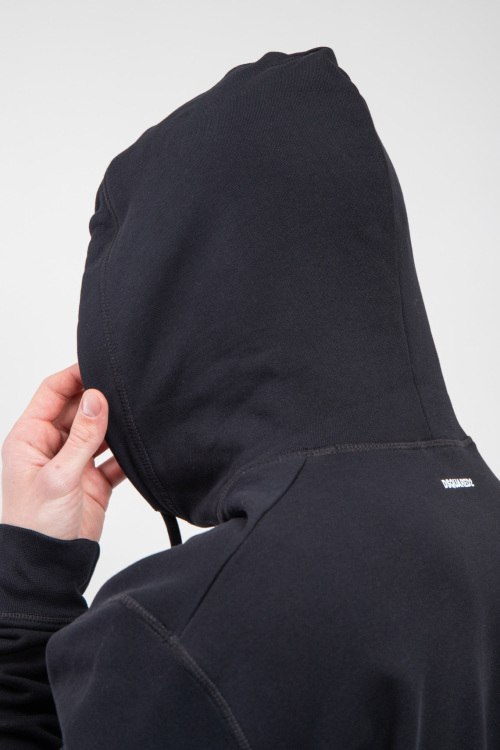 Мужской черный худи из хлопка от Dsquared2 (Дискваред). Классическая длина, вшитый капюшон, трикотажная резинка на манжетах и по низу изделия, графический принт, логотип бренда, модель утепленная флисом.