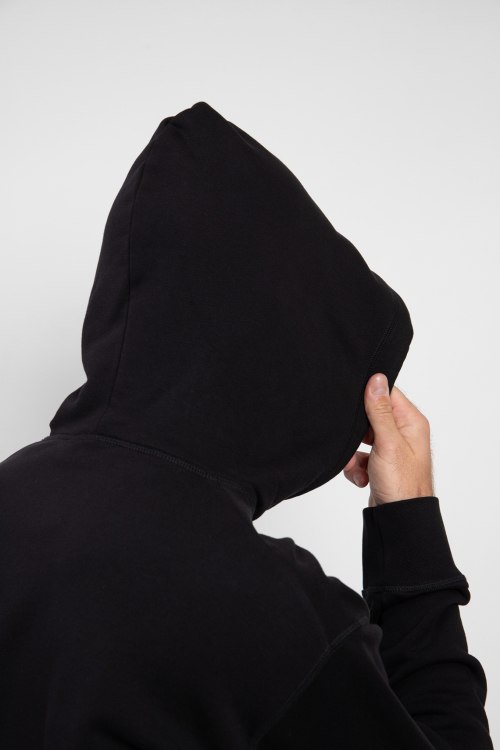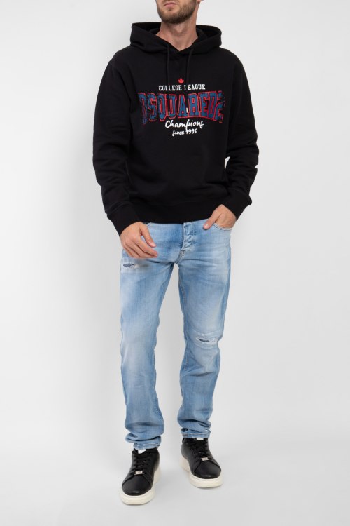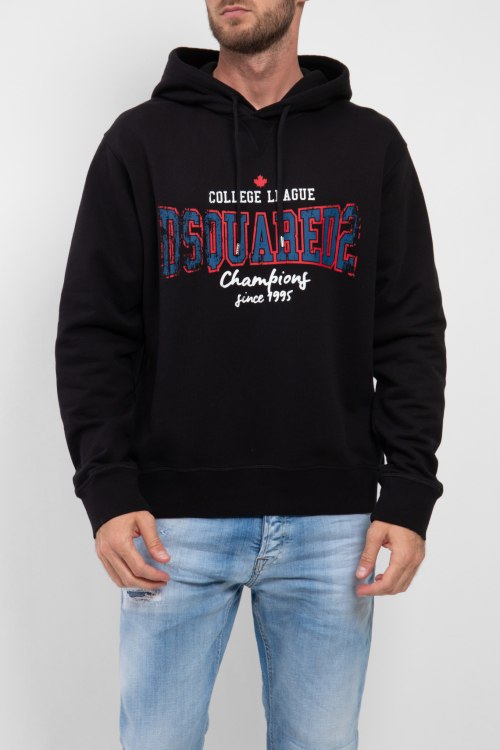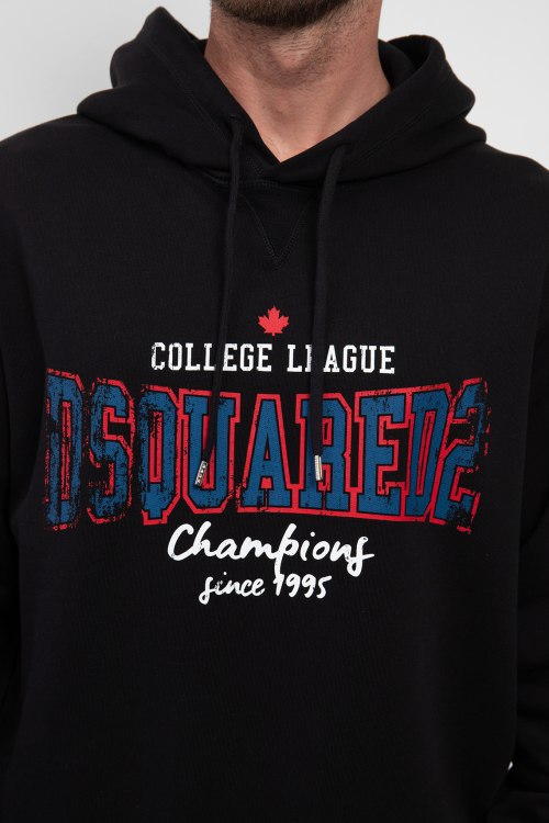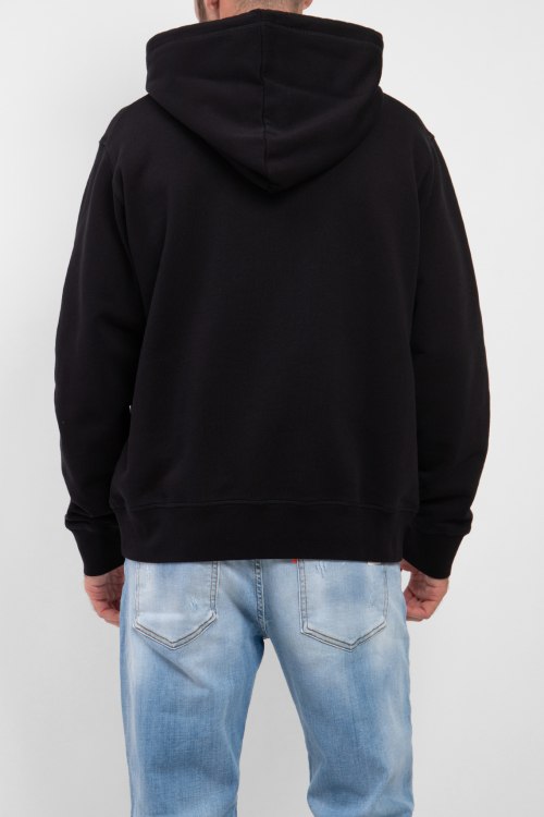 Мужской черный худи Cool Fit из хлопка от Dsquared2 (Дискваред). Классическая длина, вшитый капюшон с кулиской, длинные рукава, трикотажная резинка на манжетах и по низу изделия, модель декорирована графическим принтом с логотипом бренда на груди.