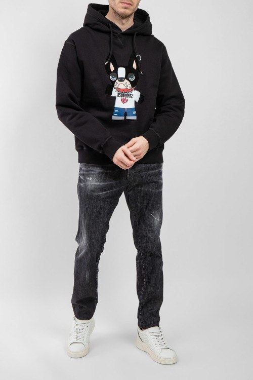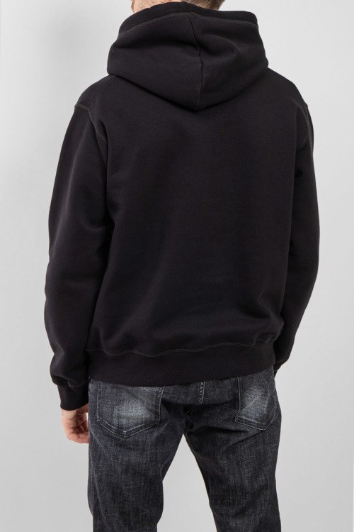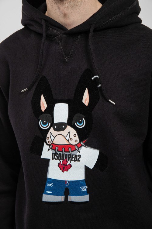 Мужской черный худи из хлопка от Dsquared2 (Дискваред). Вшитый капюшон с кулиской, длинные рукава, трикотажная резинка на манжетах и по низу изделия, модель декорирована графическим принтом с логотипом, модель утепленная флисом.