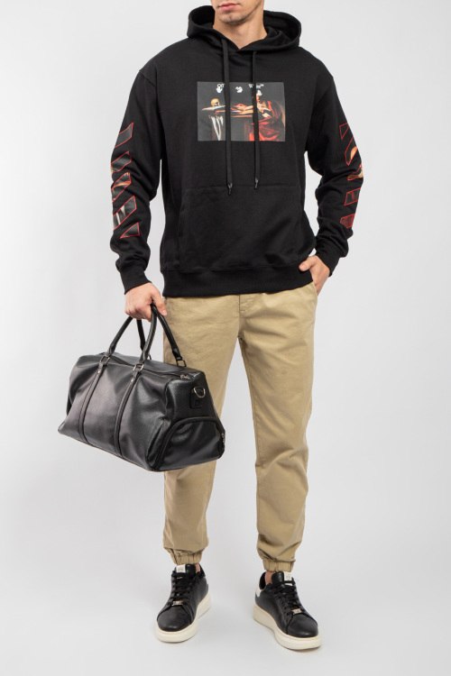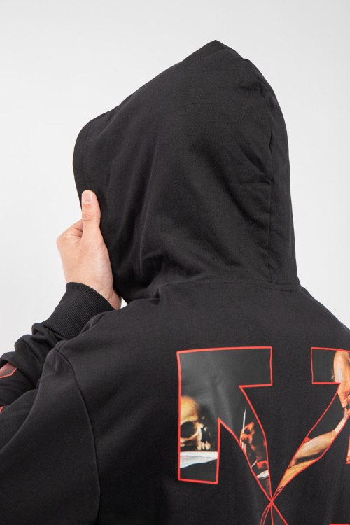 Мужской черный хлопковый худи Caravaggio от Off-White (Офф-Вайт). Принт на груди и на рукавах, логотип на спине, капюшон на завязках, карман-кенгуру, классическая длина, трикотажные манжеты и нижний край.
