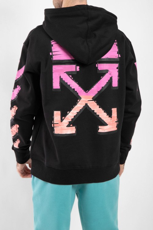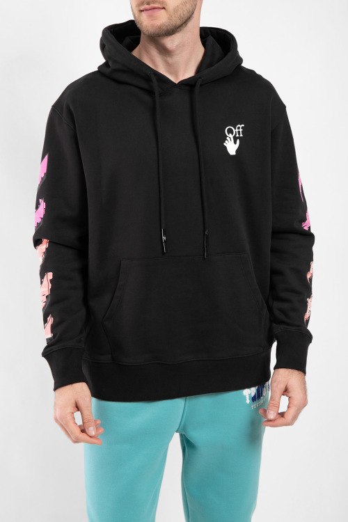 Детали: Мужской черный хлопковый худи от Off-White (Офф-Вайт). Капюшон на завязках, принт с логотипом на груди и на спине, принт на рукавах, карман-кенгуру, классическая длина, трикотажные манжеты и нижний край