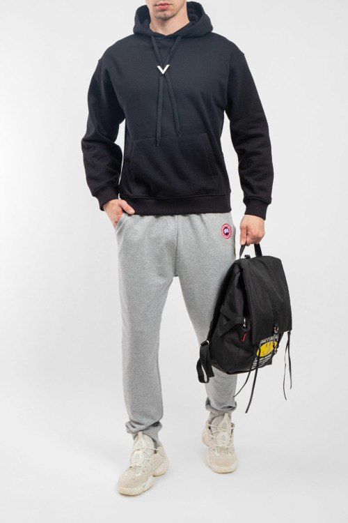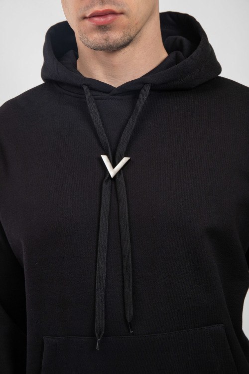 Мужской черный худи из хлопка от Valentino (Валентино). Фасон oversize, вшитый капюшон с кулиской, длинные рукава, манжеты и низ изделия на трикотажной резинке, карман-кенгуру. Замеры для размера на фото: S; длина - 67 см; ПОГ - 58 см; ПОТ - 56 см; ПОБ - 53,5 см; длина по внутреннему шву рукава - 49 см; ширина рукава - 25,5 см.