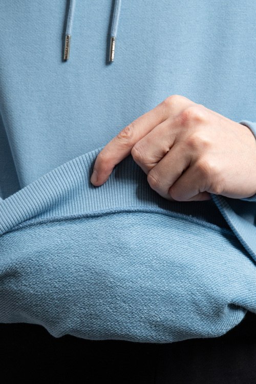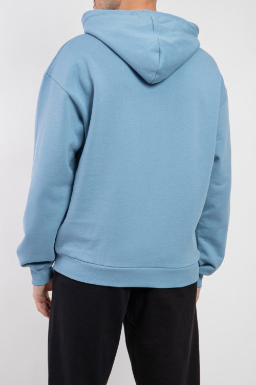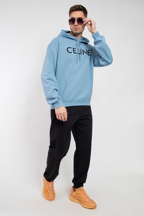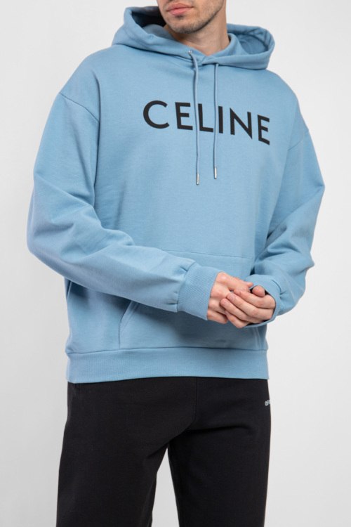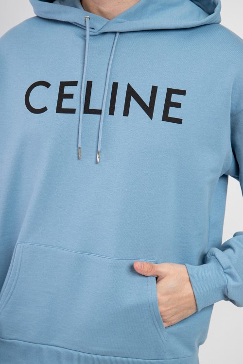 Голубой хлопковый худи от Celine (Селин). Модель Unisex. Принт с логотипом на груди, капюшон на завязках, карман-кенгуру, классическая длина, трикотажные манжеты и нижний край