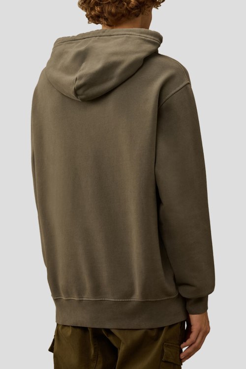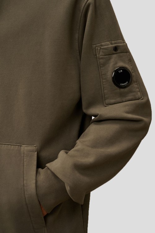 Детали: Мужской хлопковый худи цвета светлого хаки от C.P. Company (СиПи Компани). Капюшон на завязках, логотип на рукаве, карман-кенгуру, классическая длина, трикотажные манжеты и нижний край