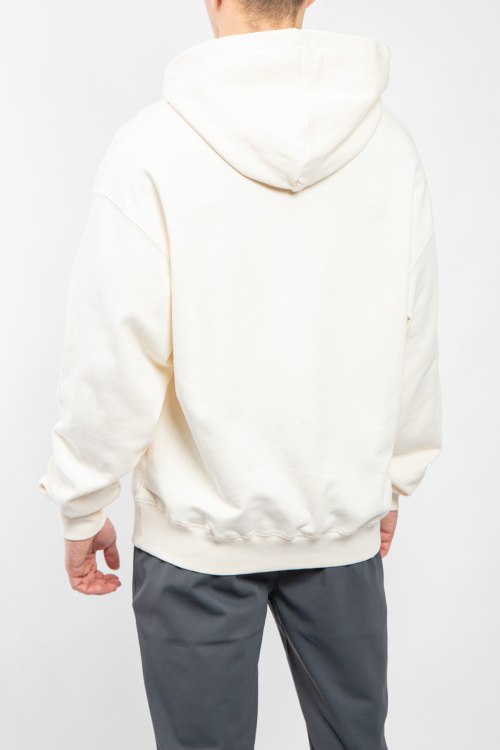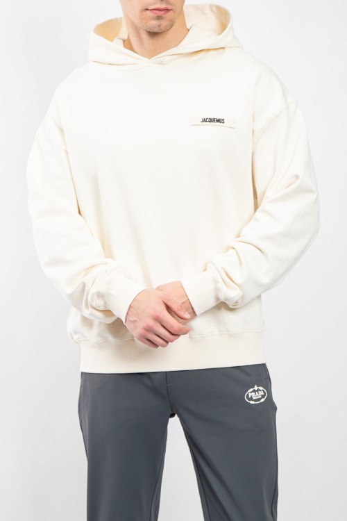 Мужской хлопковый худи молочного оттенка Gros Grain от Jacquemus (Жакмюс). Вшитый капюшон, логотип на груди, классическая длина, трикотажные манжеты и нижний край. Замеры для размера L: ширина по груди: 66 см, ширина по низу: 55 см, длина рукава: 71 см. Замеры для размера XL: ширина по груди: 64 см, ширина по низу: 52 см, длина рукава: 68 см.