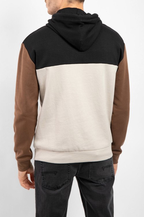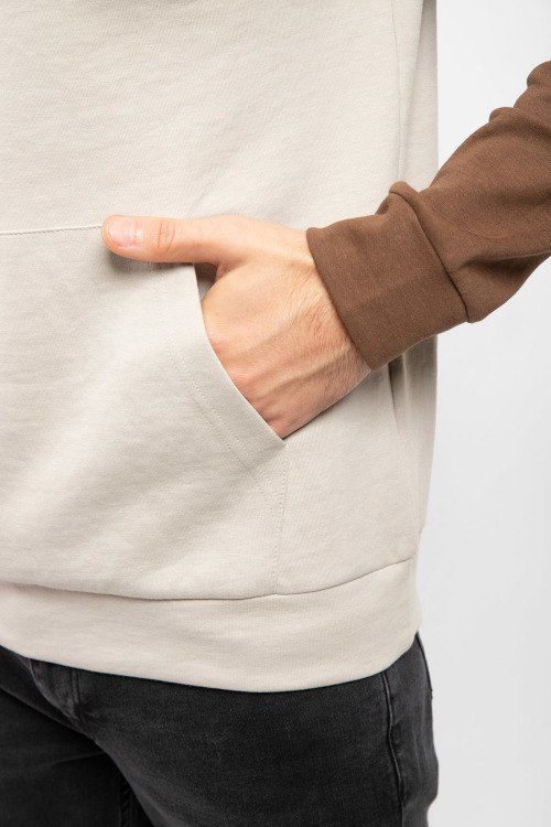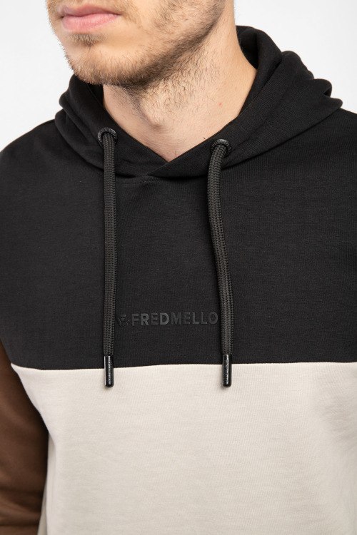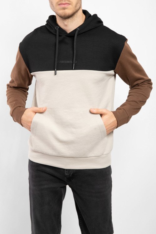 Мужской худи из хлопкового микса от Fred Mello (Фред Мелло). Комбинированный дизайн, вшитый капюшон с кулиской, карман-кенгуру, логотип бренда на груди, трикотажная резинка на манжетах и по низу изделия.