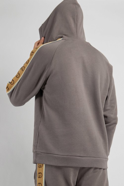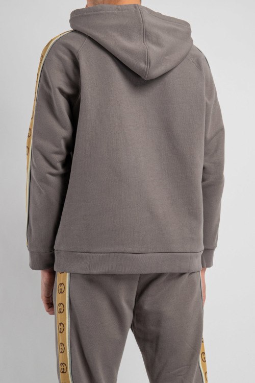 Детали: Мужской хлопковый серый худи от Gucci (Гуччи). Классическая длина, вшитый капюшон, длинные рукава, брендированные лампасы вдоль рукавов, трикотажная резинка на манжетах и по низу изделия. Дополните свой образ серыми брюками с лампасами.