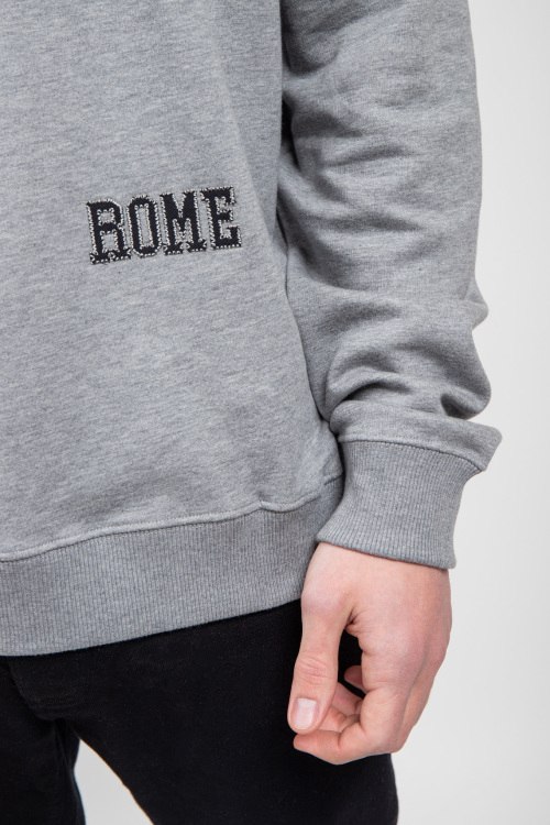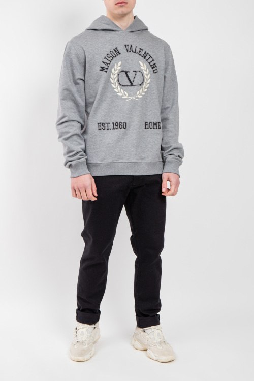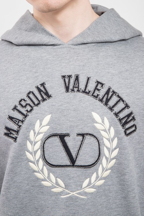 Мужской серый худи из хлопка от Valentino (Валентино). Классическая длина, вшитый капюшон, длинные рукава, трикотажная резинка на манжетах и по низу изделия, вышитый логотип бренда.