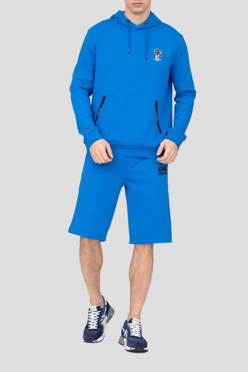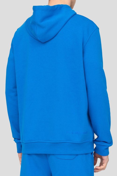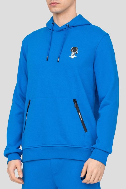 Детали: Мужской синий хлопковый худи от Karl Lagerfeld (Карл Лагерфельд). Капюшон на завязках, логотип на груди, карман-кенгуру на молниях, классическая длина, трикотажные манжеты и нижний край