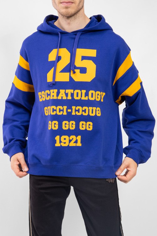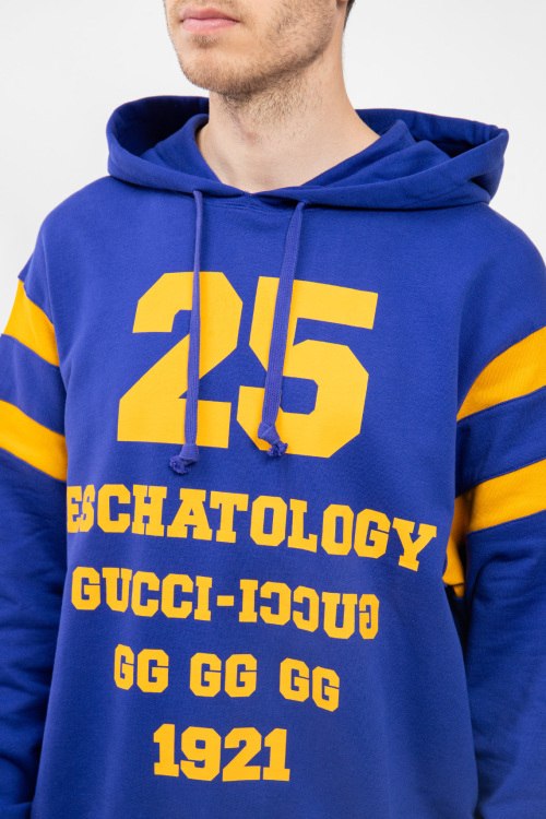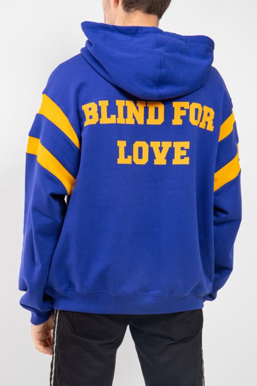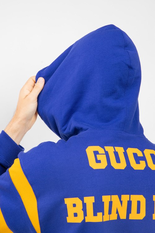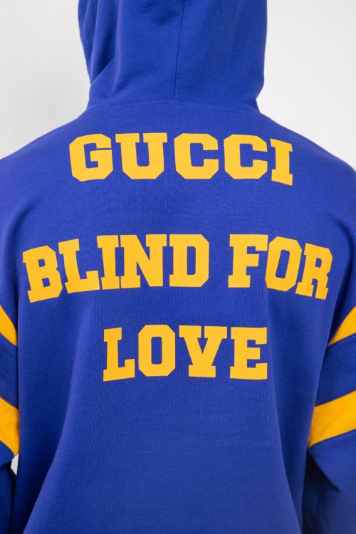 Мужской синий худи Blind For Love из хлопка от Gucci (Гуччи). Вшитый капюшон, комбинация цветов, принт на спине и на груди, длинные рукава, манжеты и нижний край изделия на трикотажной резинке.
