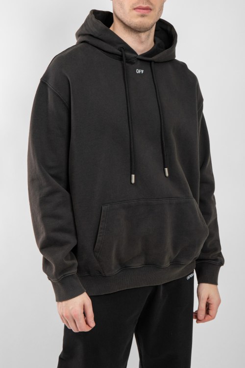 Мужской темно-серый хлопковый худи от Off-White (Офф-Вайт). Принт спереди и сзади, капюшон на завязках, карман-кенгуру, классическая длина, трикотажные манжеты и нижний край.