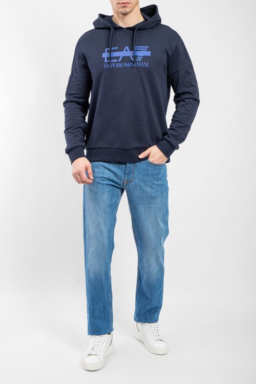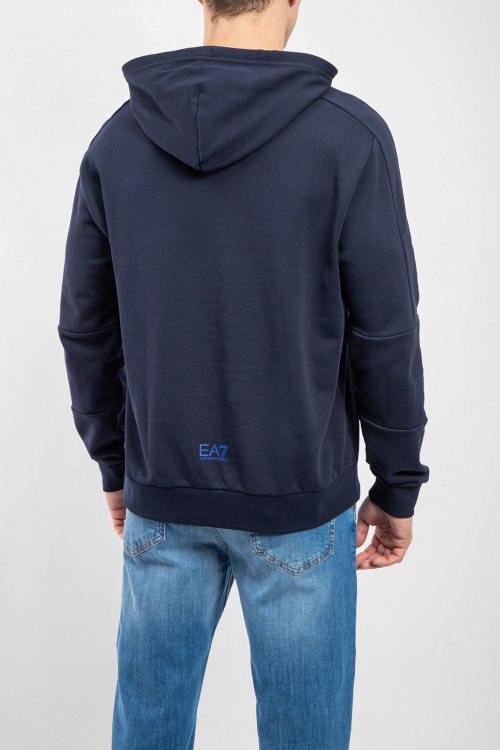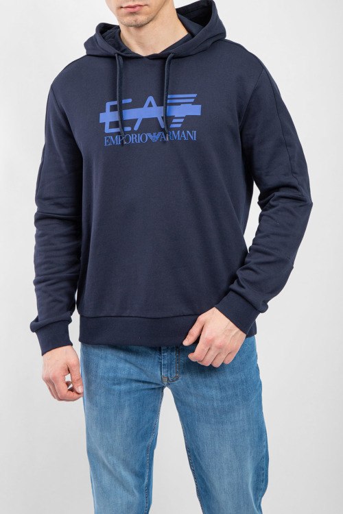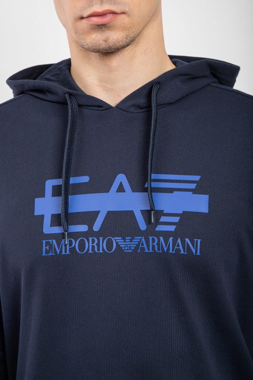 Мужской темно-синий худи из хлопкогового микса от EA7 Emporio Armani (ЕА7 Эмпорио Армани). Вшитый капюш, длинные рукава, логотип бренда на груди, трикотажная резинка на манжетах и по низу изделия.
