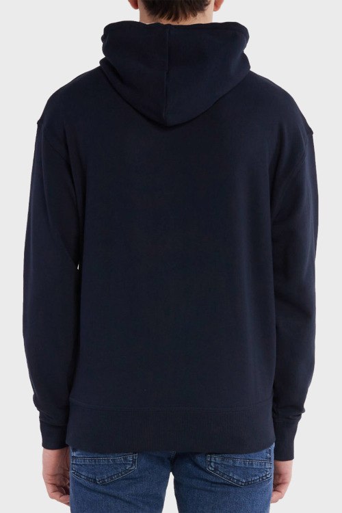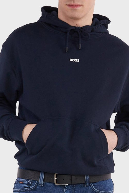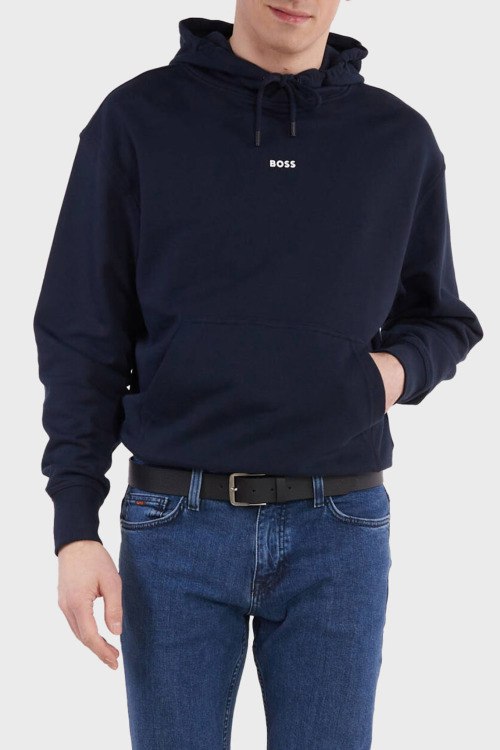 Детали: Мужской темно-синий хлопковый худи WeSmallhood от Hugo Boss (Хуго Босс). Капюшон на завязках, логотип на груди, карман-кенгуру, классическая длина, трикотажные манжеты и нижний край