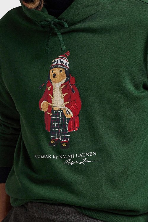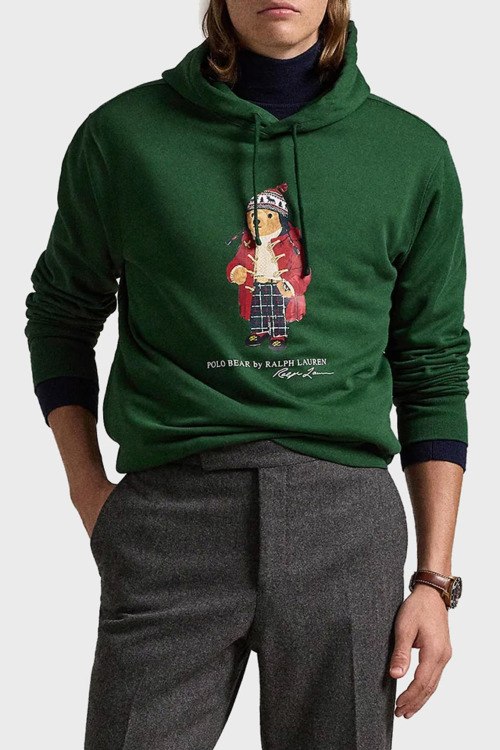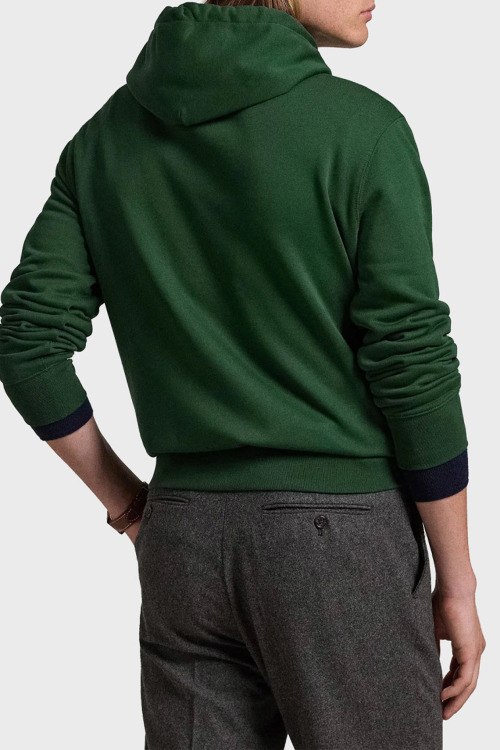 Детали: Мужской зеленый худи из хлопкового микса от Polo Ralph Lauren (Поло Ральф Лорен). Вшитый капюшон с кулиской, длинные рукава, манжеты и низу изделия в рубчик, брендированный принт на груди