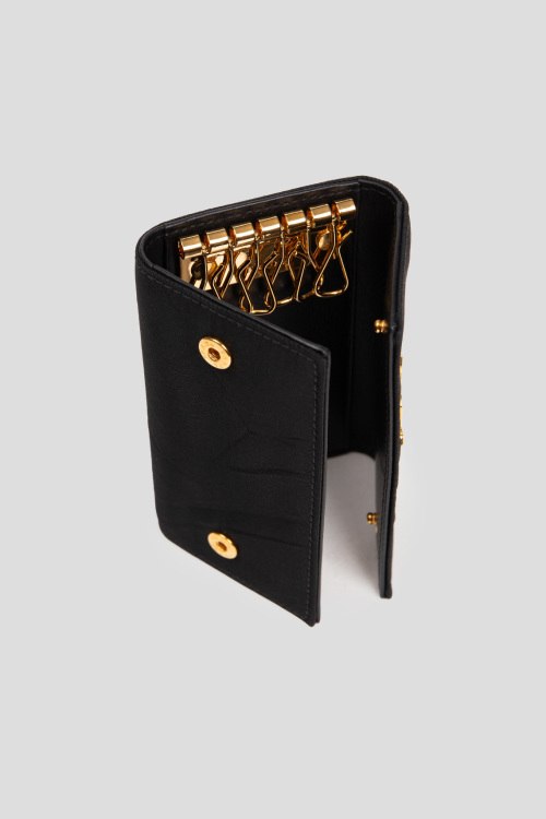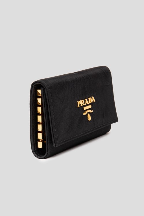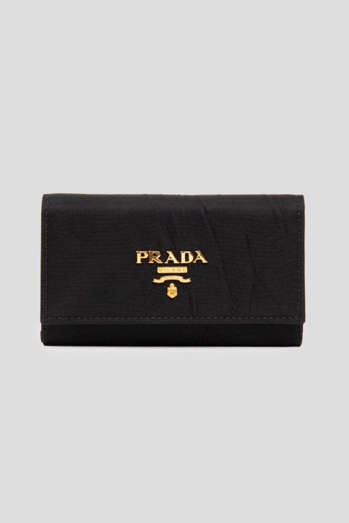 Детали: Мужская черная текстильная ключница от Prada (Прада). Значок с логотипом, золотистая фурнитура, застежка на копку, золотистые подвески для ключей
