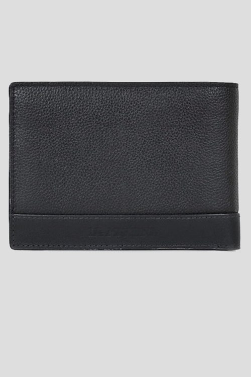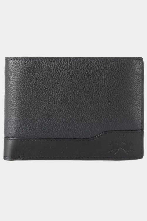 Детали: Мужской черный кожаный кошелек от La Martina (Ла Мартина). Прямоугольная форма, отдел для бумажных купюр, прорезные отверстия для карт, карман для копеек, снаружи и внутри тиснения с фирменными символами. Размер: 13 x 9,5 x 1,5 см