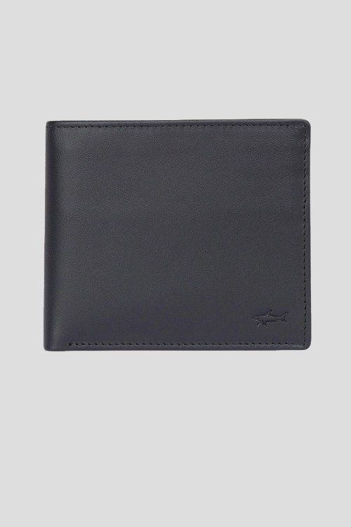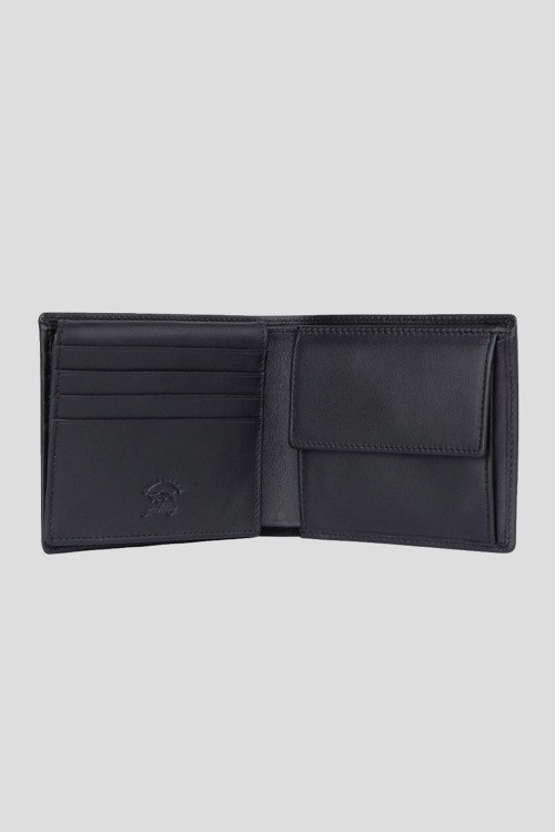 Детали: Мужской черный кошелек из натуральной кожи от Paul & Shark (Пол энд Шарк). Модель без застежки, слоты для кредитных карт, карман на кнопке для монет, отделение для купюр, тиснение с логотипом бренда. Размер: 11 х 10 х 2 см