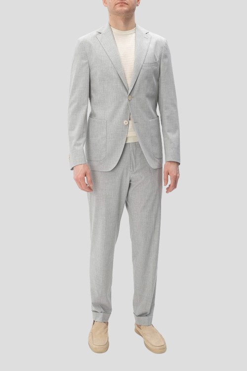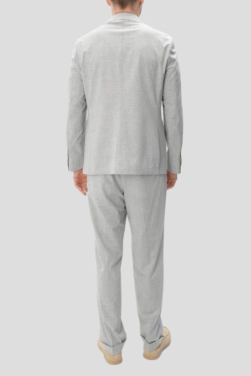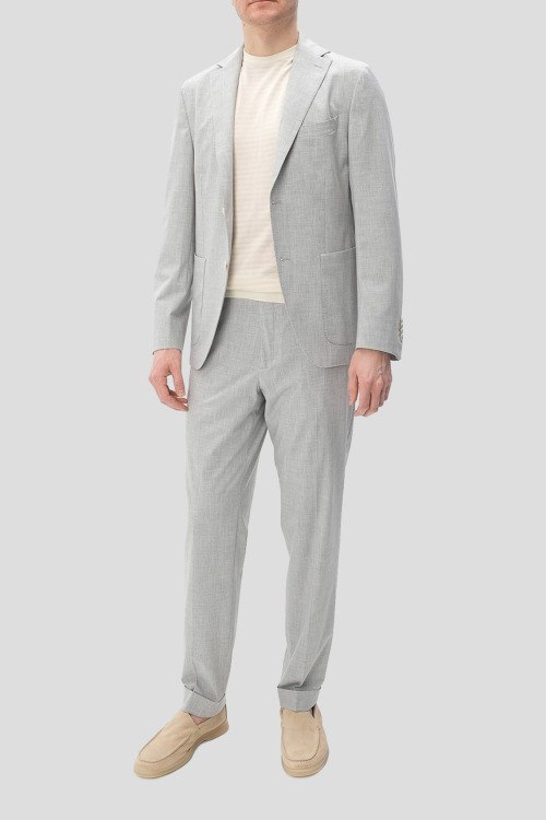 Детали: Мужской серый костюм из полиэстера и вискозы от Paul Taylor (Пол Тейлор). Пиджак с отложным воротником, застежка на пуговицы, накладные карманы, брюки классической длины, застежка на молнию и пуговицу, прорезные карманы
