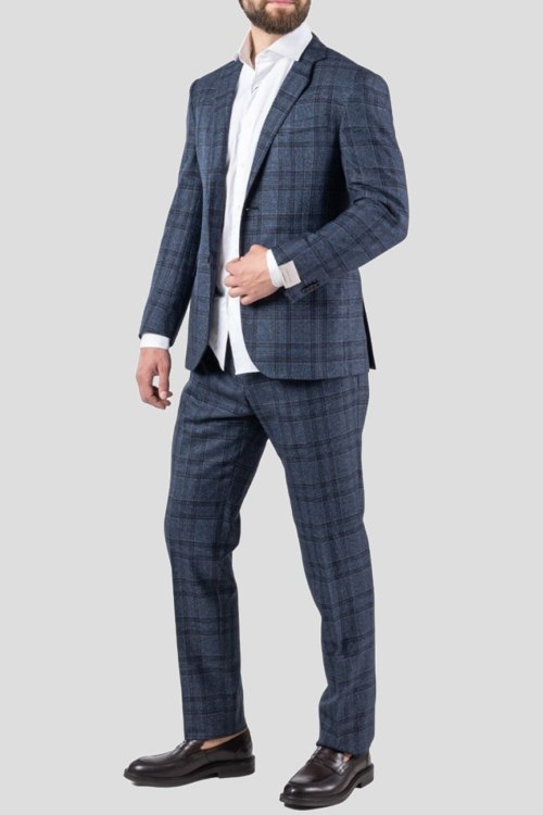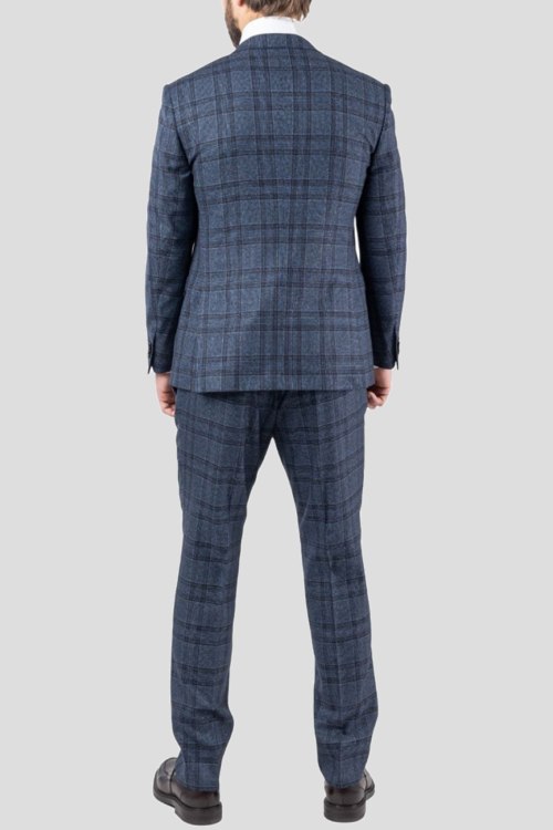 Детали: Мужской синий костюм из натуральной шерсти от Corneliani (Корнелиани). Классическая модель в клетку, однобортный пиджак застегивается на пуговицы, отложной воротник с лацканами, фигурный низ, внутренние карманы, нагрудный внешний карман, два кармана с клапанами. Брюки зауженного кроя, средняя посадка, застежка на пуговицу и молнию, шлевки для ремня на поясе