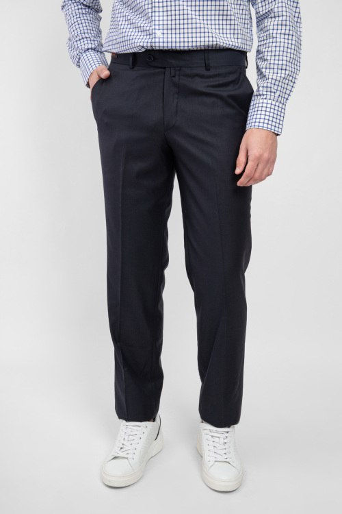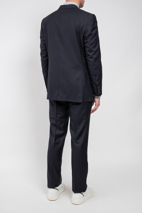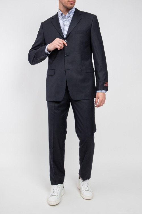 Детали: Мужской темно-синий костюм из шерсти от Franco Riveiro (Франко Ривейро). Пиджак застегивается на пуговицы, отложной воротник, два кармана с клапаном, внутренний карман, брюки классической длины, средняя посадка, застежка на молнию и пуговицу, прорезные карманы, петли в поясе для ремня.