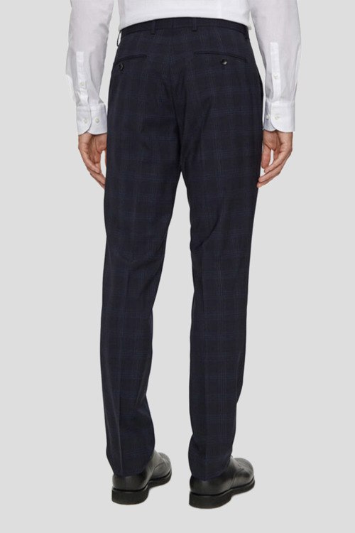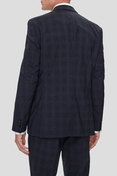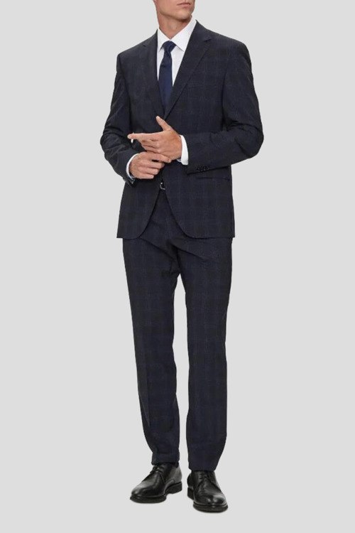 Детали: Мужской темно-синий костюм H-Jeckson из шерстяного микса от Hugo Boss (Хуго Босс). Дизайн в клетку, пиджак на пуговицах, отложной воротник, карманы с клапаном. Классические брюки, застежка на молнию и пуговицу, прорезные карманы