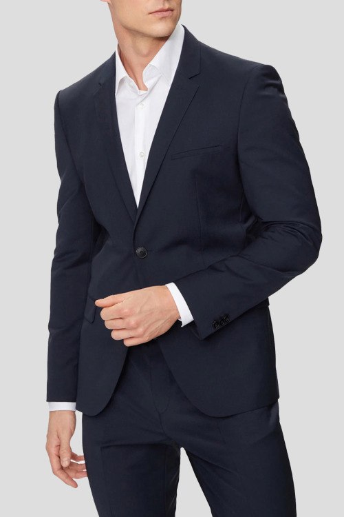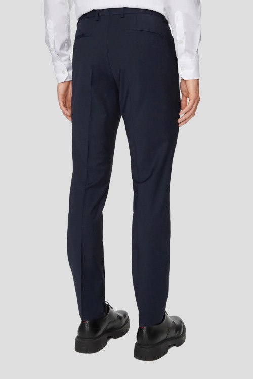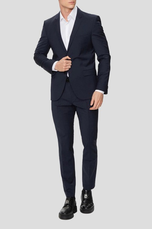Детали: Мужской темно-синий шерстяной костюм Lindbergh от Hugo by Hugo Boss (Хуго бай Хуго Босс). Пиджак: отложной воротник с заостренными лацканами, три кармана, застежка на две пуговицы, классическая длина. Брюки: дизайн со стрелками, боковые и задние карманы, пояс с петлями для ремня, зауженный крой, полная длина