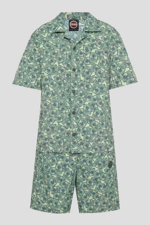 Детали: Мужской зеленый костюм из нейлона от Colmar (Колмар). Дизайн с узором, рубашка с отложным воротником, застежка на кнопки, короткие рукава, шорты с эластичным поясом и кулиской, два кармана. Замеры: длина рукава: короткий, для размера М - 25 см, обхват груди: для размера М - 114 см, обхват талии: для размера М - 112 см, длина изделия по среднему шву спинки от горловины: для размера М - 74 см. Шорты: обхват пояса: для размера М - 80 см, обхват бедер: для размера М - 110 см, длина штанины: для размера М - 55 см, длина по шаговому шву: для размера М - 22 см