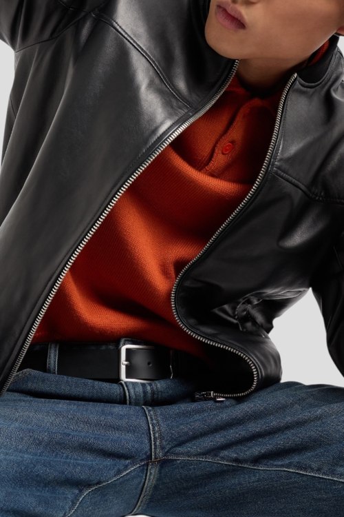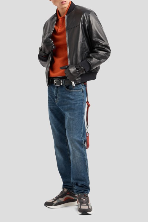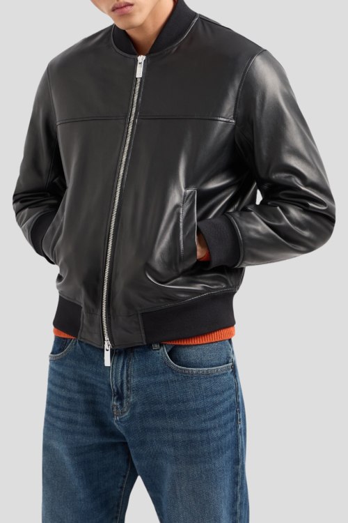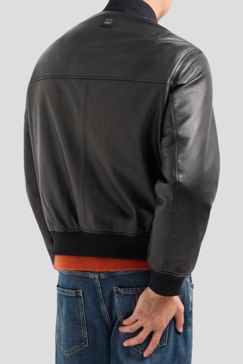 Мужская черная куртка-бомбер из натуральной кожи от Armani Exchange (Армани Эксчендж). Классическая длина, застежка на молнию, трикотажная резинка на воротнике, манжета и нижний край изделия, прорезные карманы