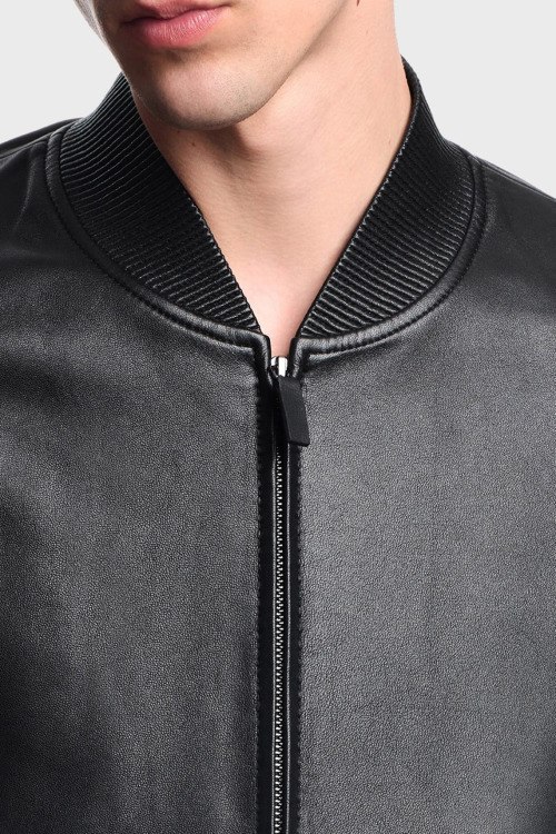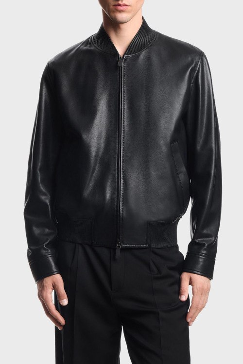 Детали: Мужской черный кожаный бомбер от Emporio Armani (Эмпорио Армани). Модель из гладкой кожи, воротник-стойка, боковые карманы, застежка-молния, классическая длина, трикотажный нижний край