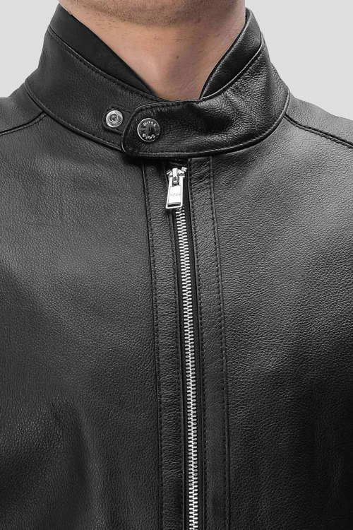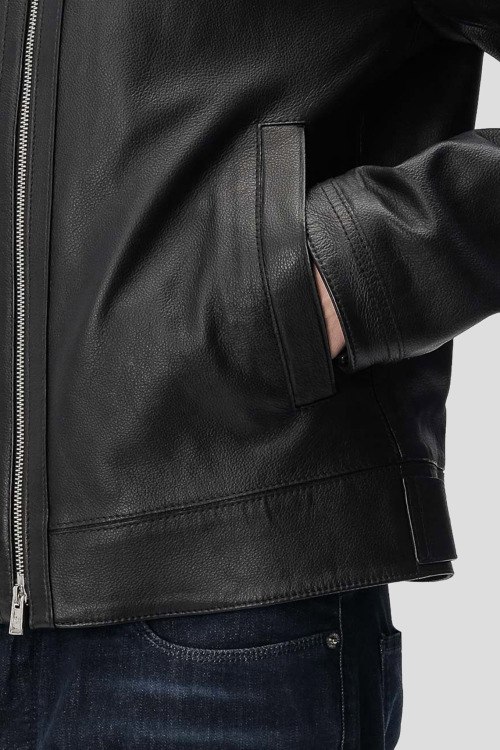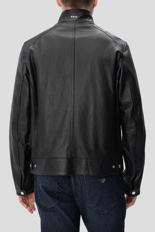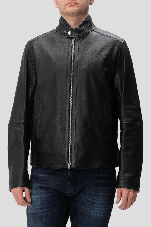 Детали: Мужская черная кожаная куртка H-Mansell3 от Hugo Boss (Хуго Босс). Модель из зернистой кожи, воротник-стойка с застежкой на кнопку, боковые карманы, застежка-молния, классическая длина