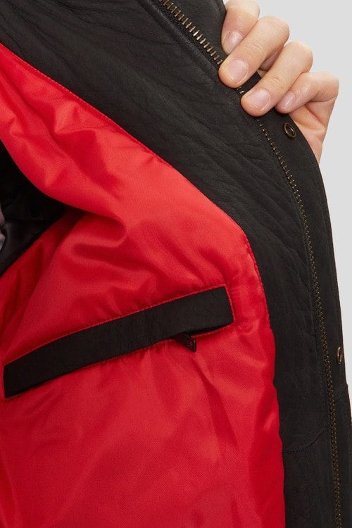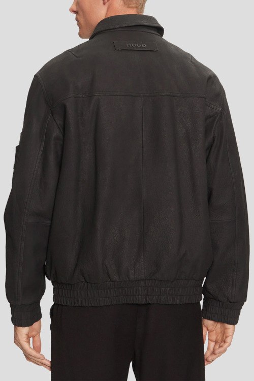 Мужская черная куртка Lamoto из натуральной кожи буйвола от Hugo by Hugo Boss (Хуго бай Хуго Босс). Классический воротник, застежка на молнию и кнопки, эластичная резинка на манжетах и по низу изделия, прорезные карманы, один внутренний карман