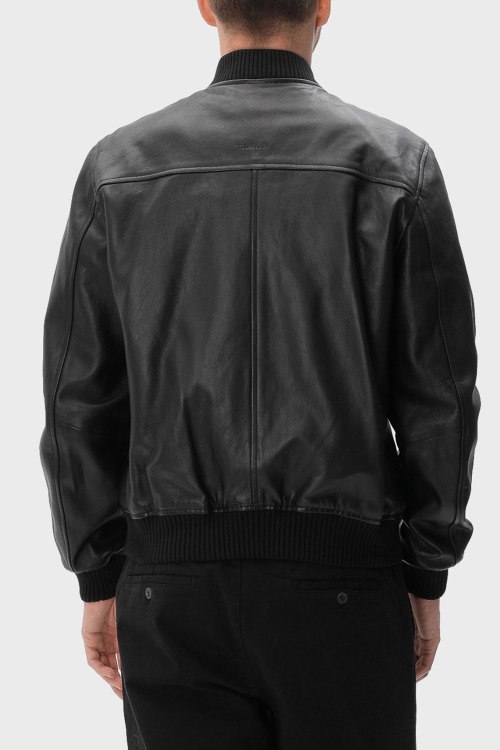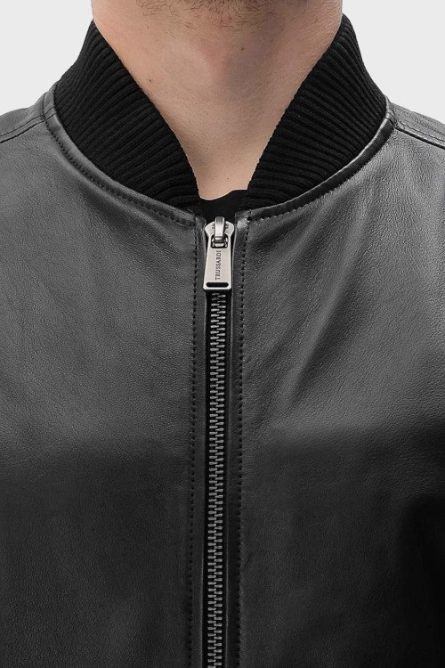 Детали: Мужской черный кожаный бомбер от Trussardi (Труссарди). Модель из гладкой кожи, воротник-стойка, боковые карманы, застежка-молния, классическая длина, трикотажные манжеты и нижний край