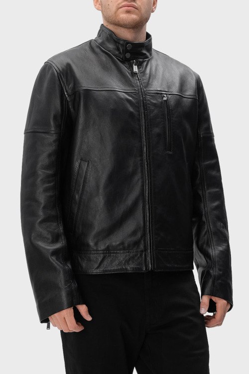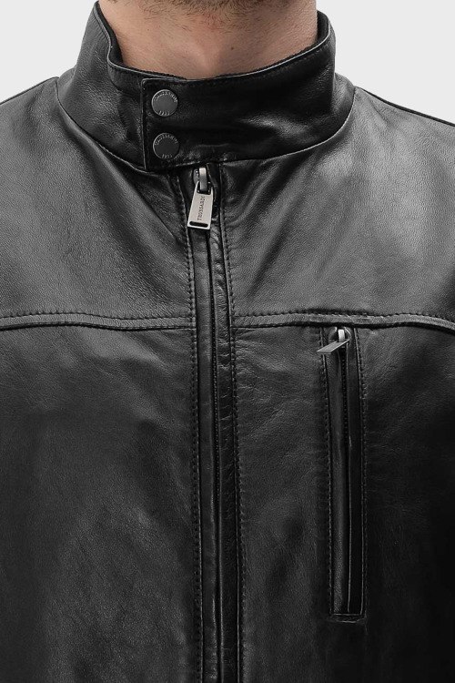 Детали: Мужская черная кожаная куртка от Trussardi (Труссарди). Модель из гладкой кожи, высокий воротник с застежкой на кнопки, три кармана, застежка-молния, классическая длина