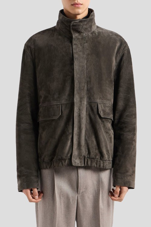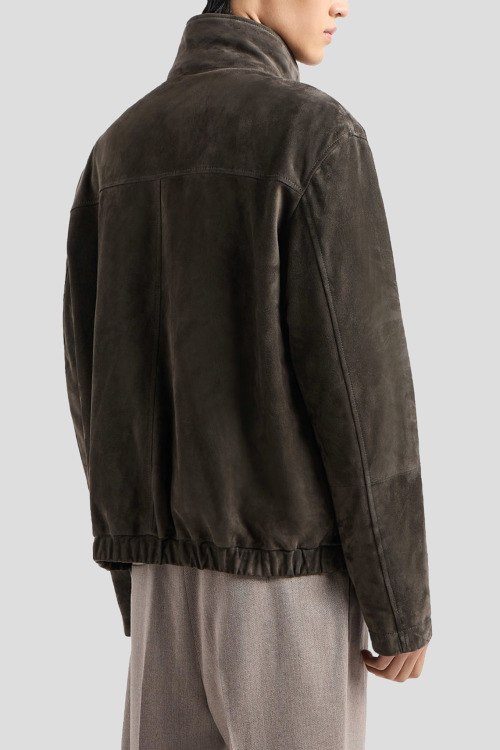 Детали: Мужская куртка из натуральной замши цвета хаки от Emporio Armani (Эмпорио Армани). Высокий воротник-стойка, застежка на кнопки, съемный стеганый воротник черного цвета, карманы с клапаном