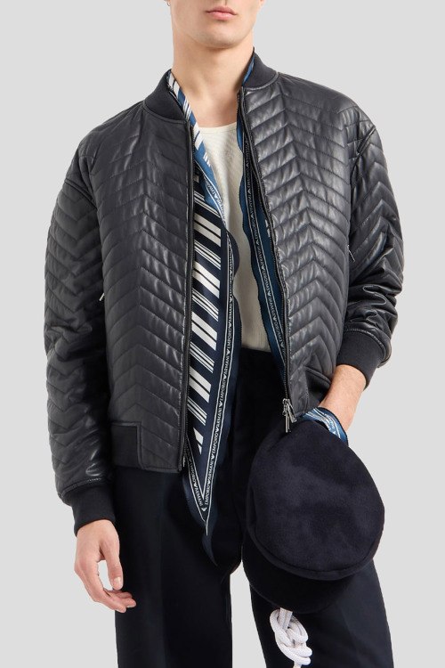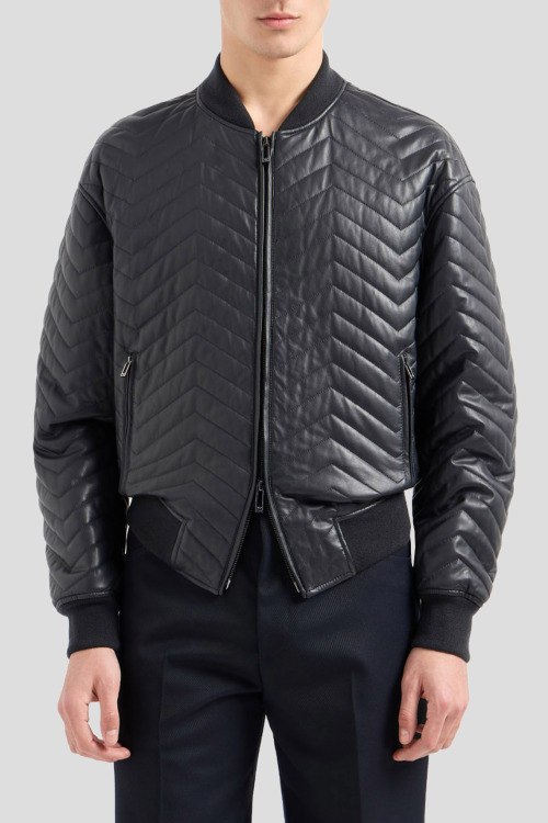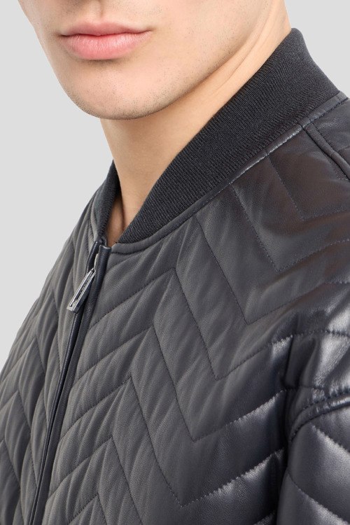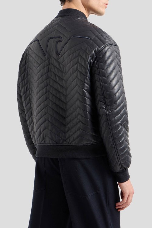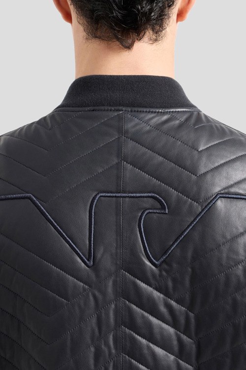 Мужская темно-синяя куртка-бомбер из натуральной кожи от Emporio Armani (Эмпорио Армани). Стеганый дизайн, застежка на молнию, вышитый логотип бренда на спине, трикотажная резинка на манжетах и по низу изделия, прорезные карманы на молнии