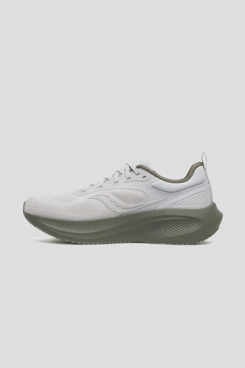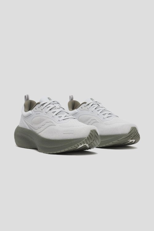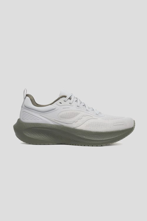 Детали: Мужские белые текстильные кроссовки Surge 3 для бега от Saucony (Сайкони). Закругленный носок, спереди классическая шнуровка, брендированные вставки, резиновая оливковая подошва, патч-лого, петля для подтягивания