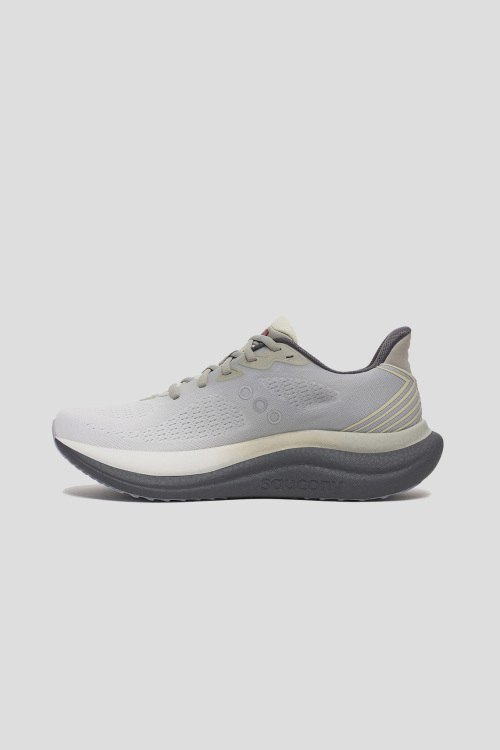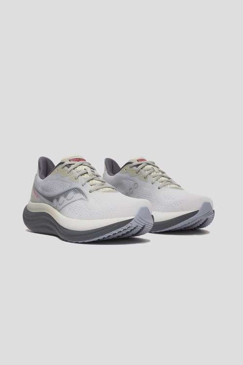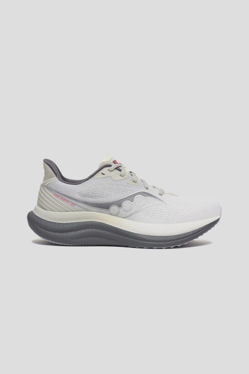 Детали: Мужские светло-серые кроссовки Triumph 23 для бега от Saucony (Сайкони). Комбинация цветов, закругленный носок, спереди шнуровка, логотип бренда, массивная подошва
