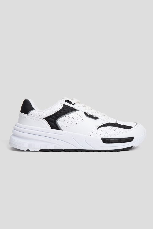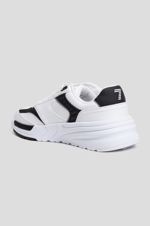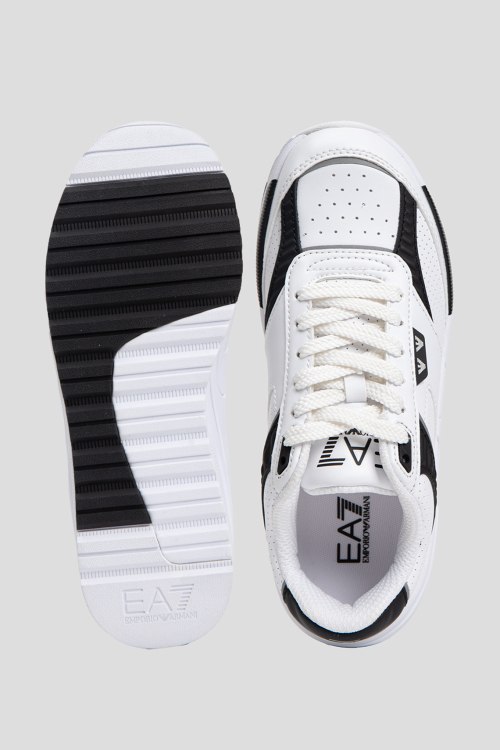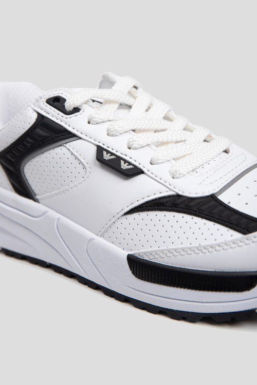 Детали: Мужские белые кроссовки из экокожи от Armani (Армани). Закругленный носок с перфорацией, комбинация цветов, спереди классическая шнуровка, логотип бренда