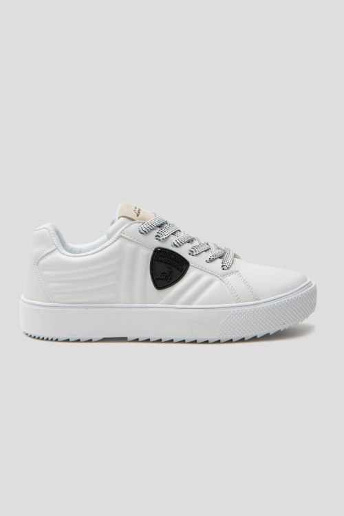 Детали: Мужские белые кроссовки из натуральной кожи от Automobili Lamborghini(Автомобили Ламборгини). Миндалевидный носок, спереди классическая шнуровка, сбоку нашивка с логотипом бренда, рельефная подошва