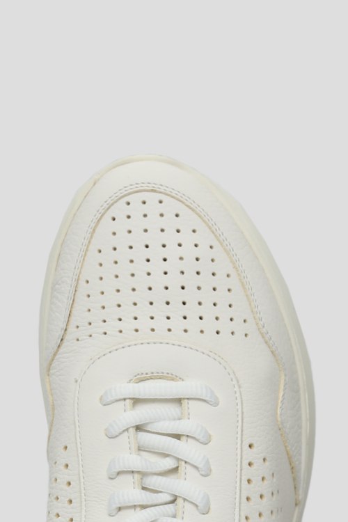 Мужские кроссовки молочного оттенка из кожи от Baldinini (Балдинини). Закругленный носок, спереди классическая шнуровка, перфорация сбоку, петля для подтягивания, рельефная подошва
