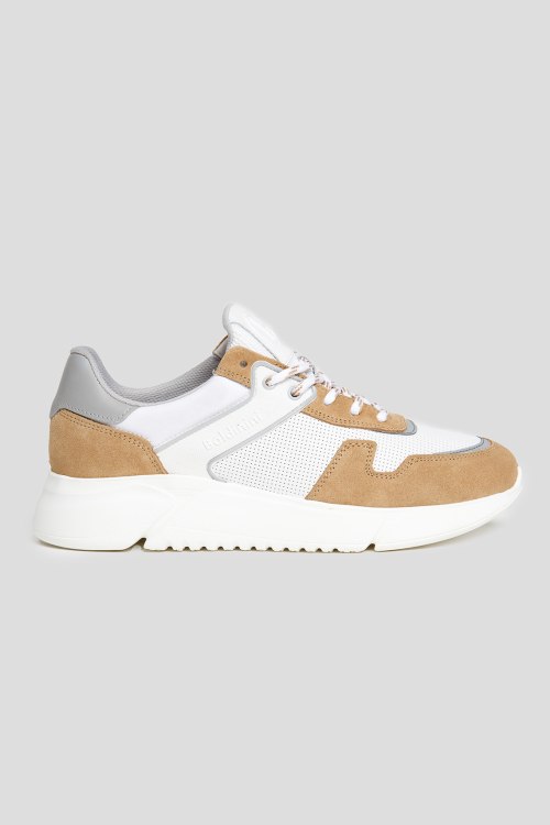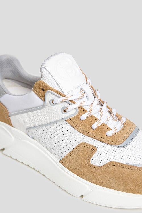 Детали: Мужские бело-бежевые кожаные кроссовки от Baldinini (Балдинини). Дизайн колор-блок, перфорированные элементы, логотип сбоку и на язычке, классическая шнуровка, миндалевидный носок, резиновая подошва
