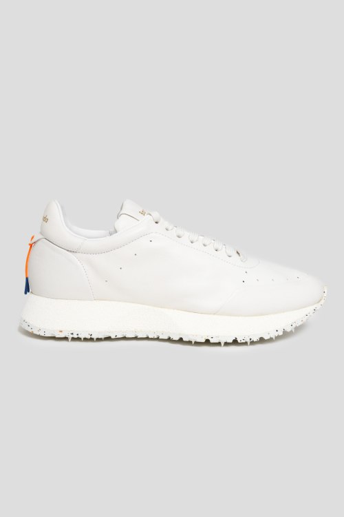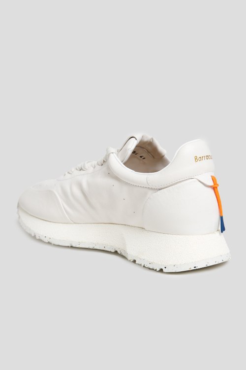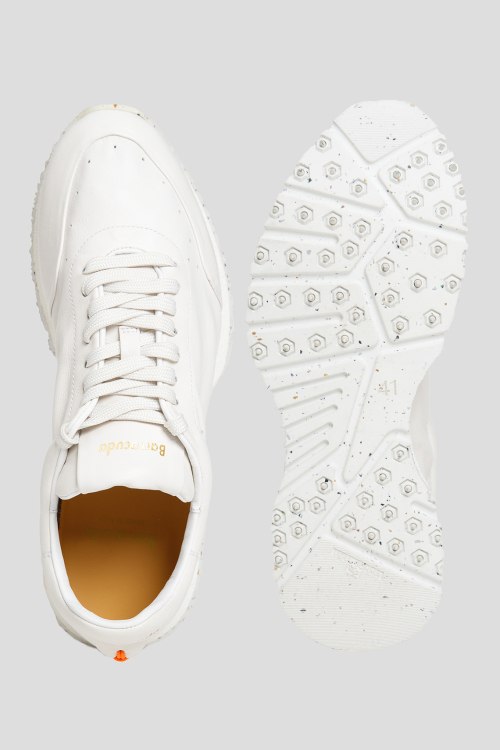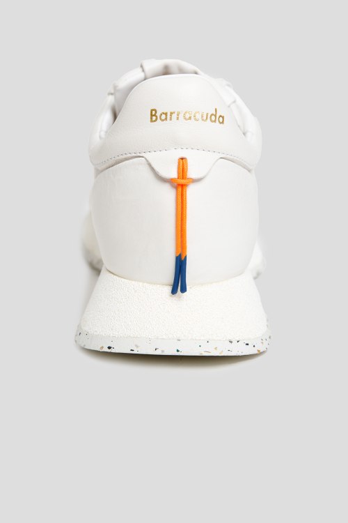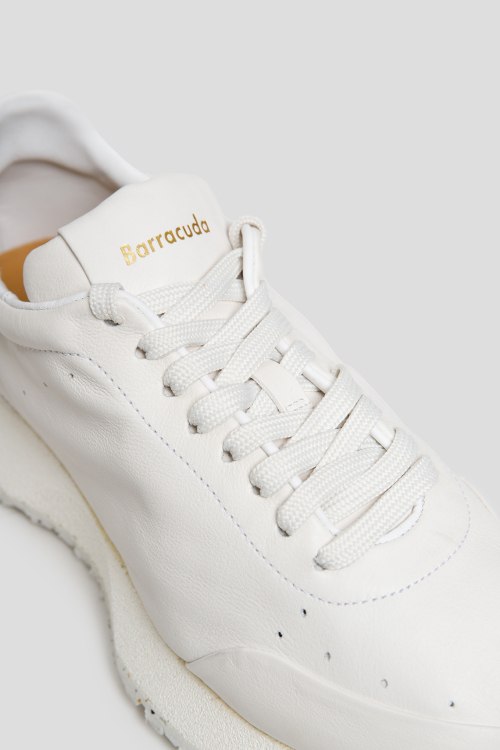 Мужские белые кожаные кроссовки от Barracuda (Барракуда). Нашивка с логотипом на язычке, принт с логотипом на пятке, классическая шнуровка, миндалевидный носок, резиновая подошва.
