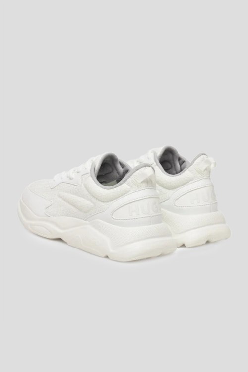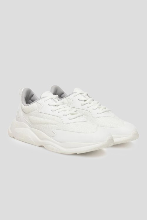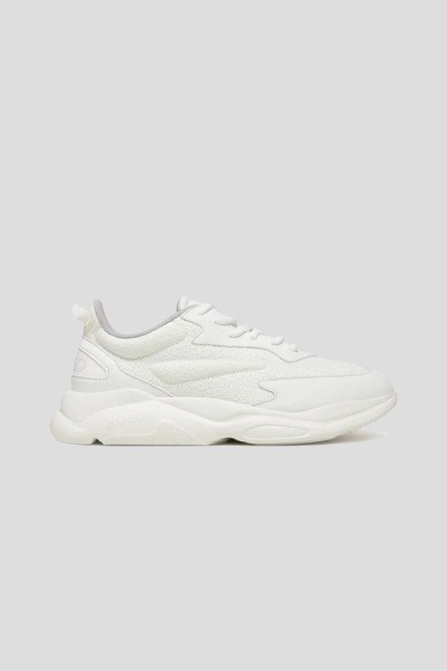Детали: Мужские белые кроссовки из кожи и текстиля Leon от Hugo by Hugo Boss (Хуго бай Хуго Босс). Комбинация материалов, монограмма бренда, классическая шнуровка, петля для подтягивания сзади, закругленный носок