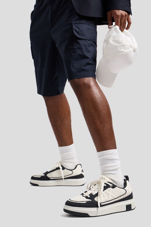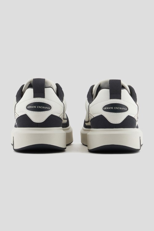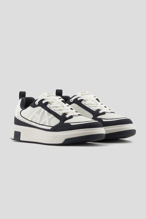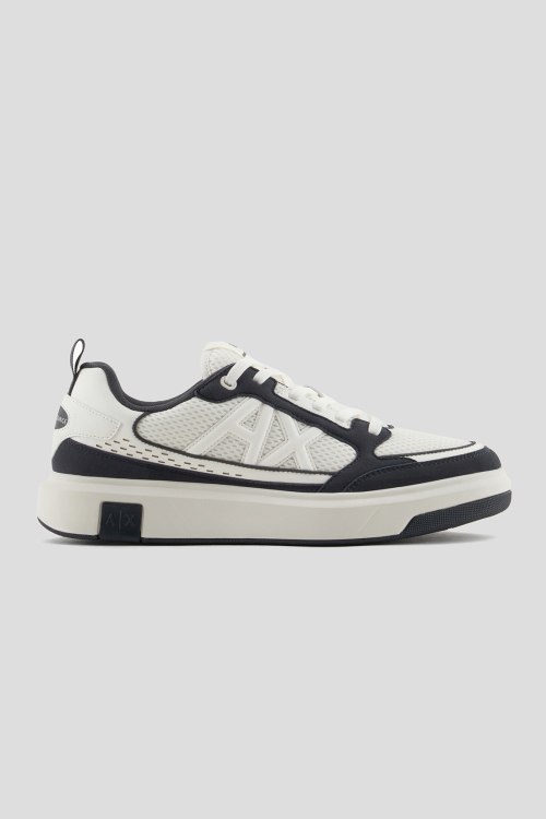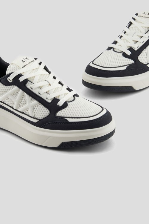 Детали: Мужские бело-синие текстильные кроссовки от Armani Exchange (Армани Эксчендж). Комбинация цветов и материалов, логотип сбоку, на пятке и на язычке, классическая шнуровка, петля для подтягивания сзади, закругленный носок, брендированная подошва
