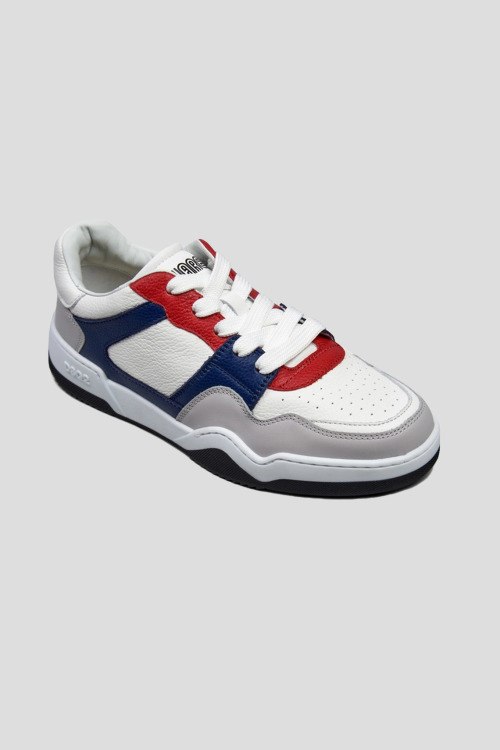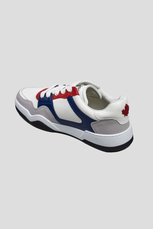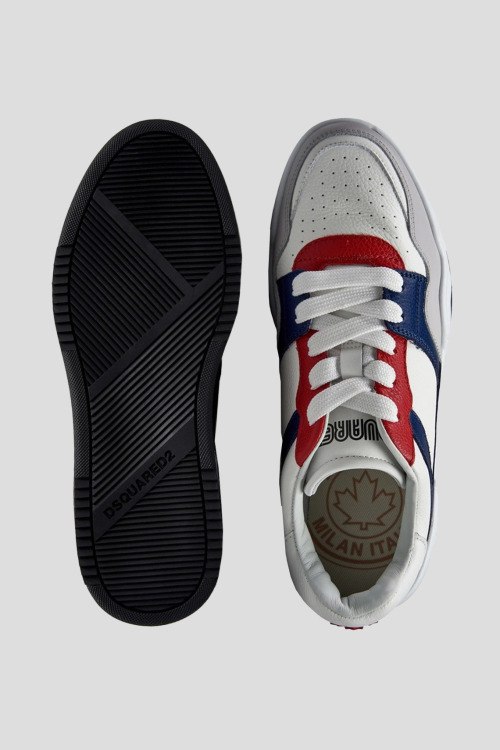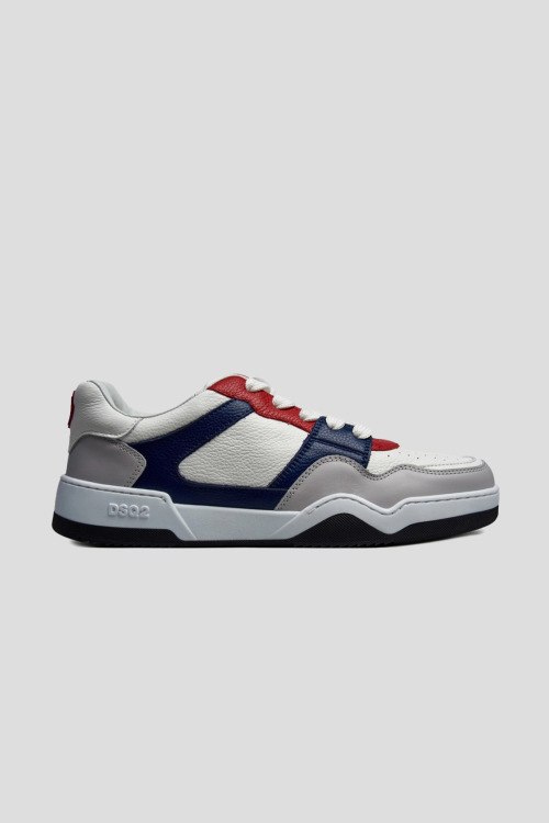 Детали: Мужские белые кроссовки из натуральной кожи от Dsquared2 (Дискваред). Закругленный носок, классическая шнуровка, черно-белая подошва с фактурным логотипом, перфорация спереди, патч-лого, красные и синие вставки