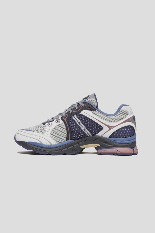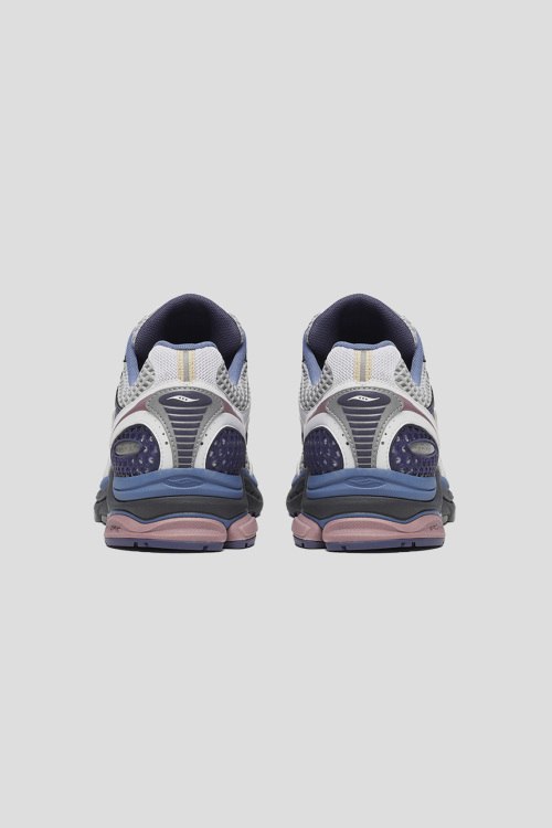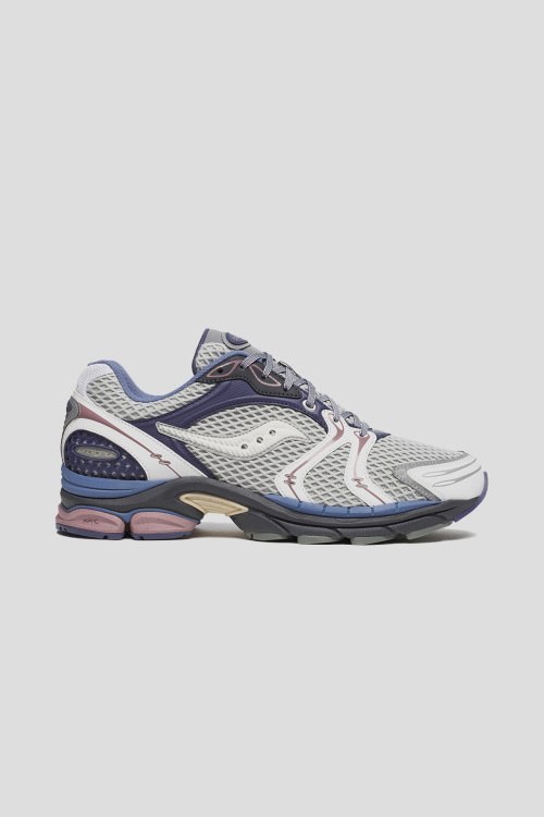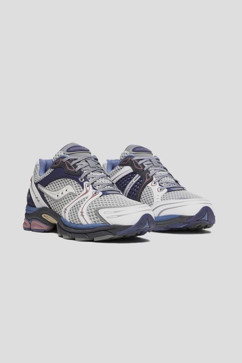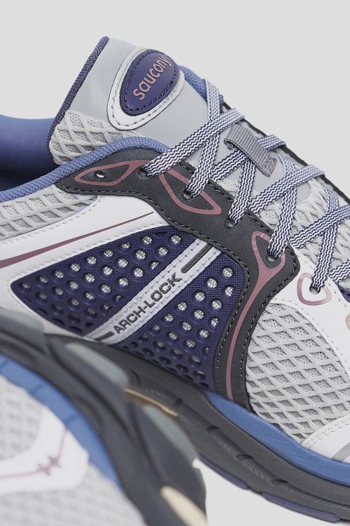 Детали: Мужские бело-синие кроссовки Grid Aura X от Saucony (Сайкони). СЕтчатые вставки, комбинация цветов и материалов, закругленный носок, спереди классическая шнуровка, патч-лого, резиновая подошва